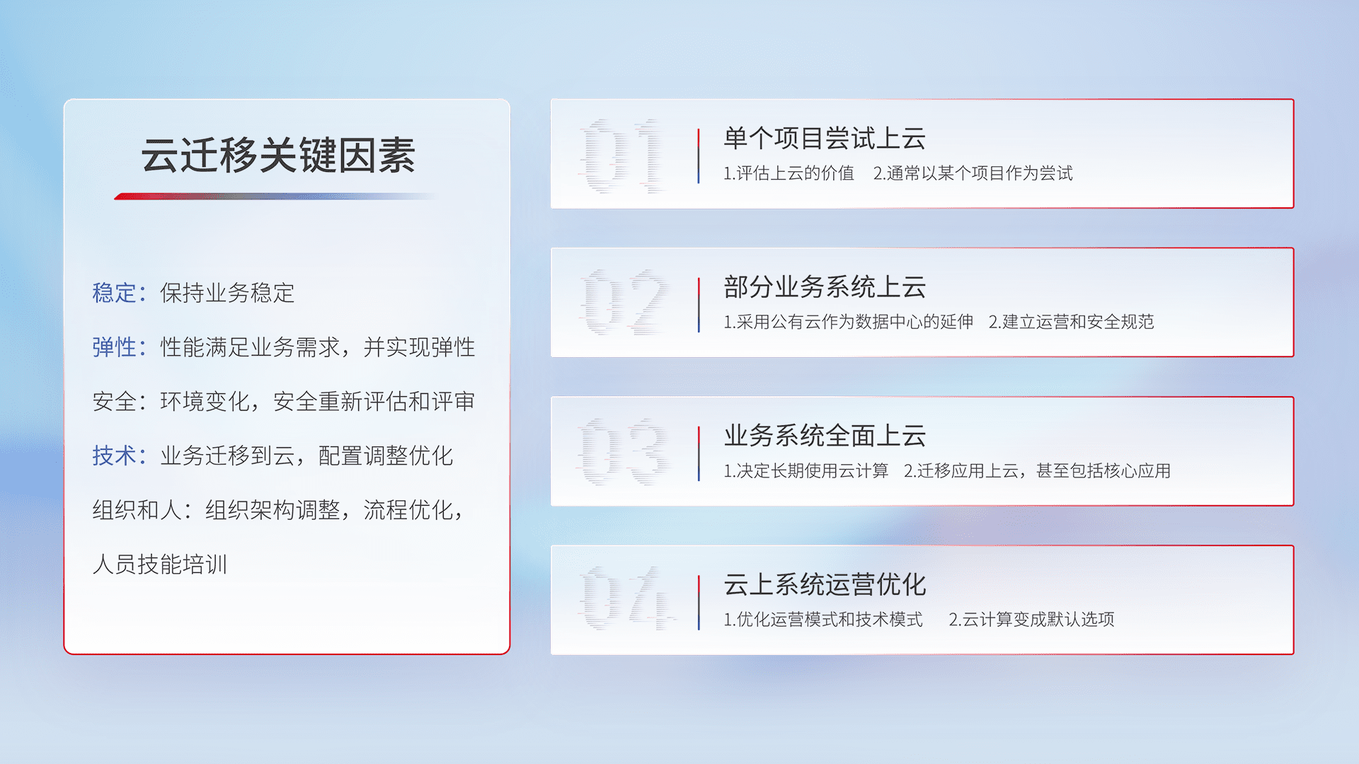 结合实际业务,,,从规划设计、、、云平台选型、、云原生改造、、数据迁移、、、集成交付,,,,迁移全过程为客户识别最佳上云路径,,,,做好风险识别管理,,,,设计网络架构、、、身份权限、、、、安全审计合规、、、、操作审计、、日志审计、、、监控告警策略、、多站点容灾设计等,,,,对云上基础设施进行整体规划,,,,提升IT治理水平,,,以满足弹性、、、高可用、、、、高性能的需求。。